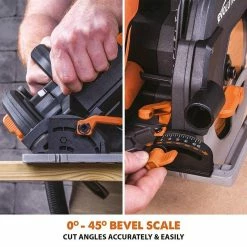 - 0° – 45° bevel tilt with virtual pivot keeps the blade on the same cutting line at any angle when fixed to a track.