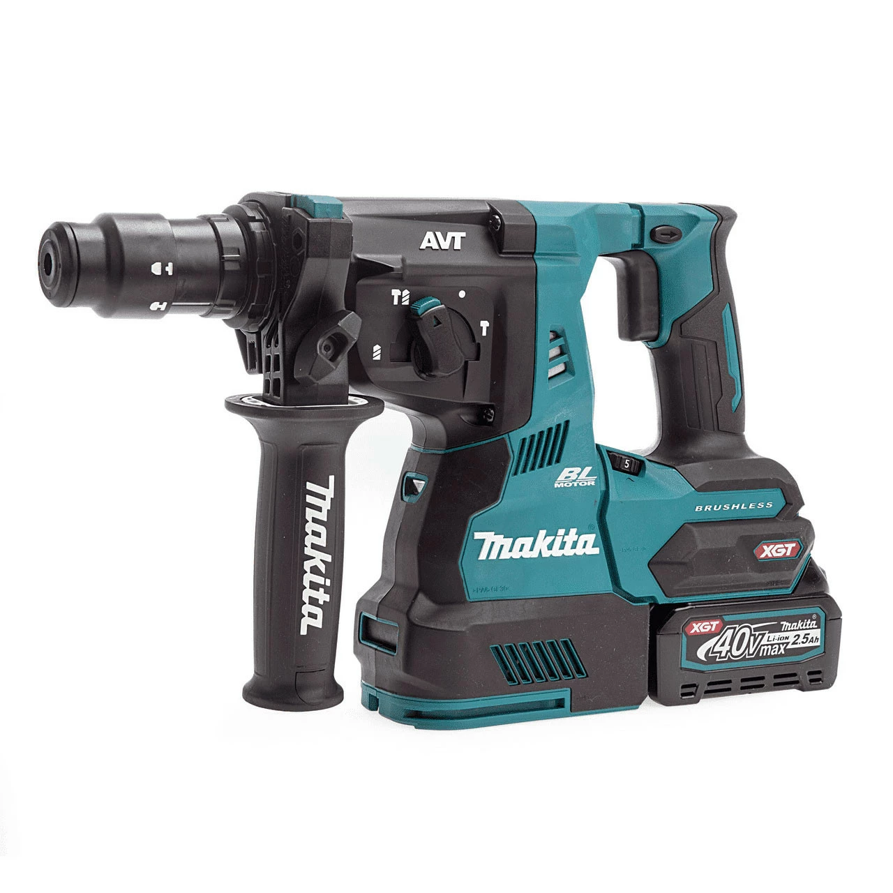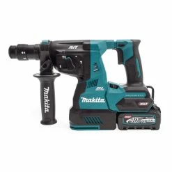 The Makita HR004GD201 is an SDS Plus Brushless Hammer Drill, part of the Makita 40V Max XGT Series. This hammer drill has a “Soft no load” function which automatically reduces the motor speed during idling to suppress the vibration of the machine body. Among its unique features are also a LED job light, and an electric brake. Comes supplied with 2x 2.5Ah Batteries, XGT Fast Charger, and Makpac Type 4 Carry Case with an Inlay.ย